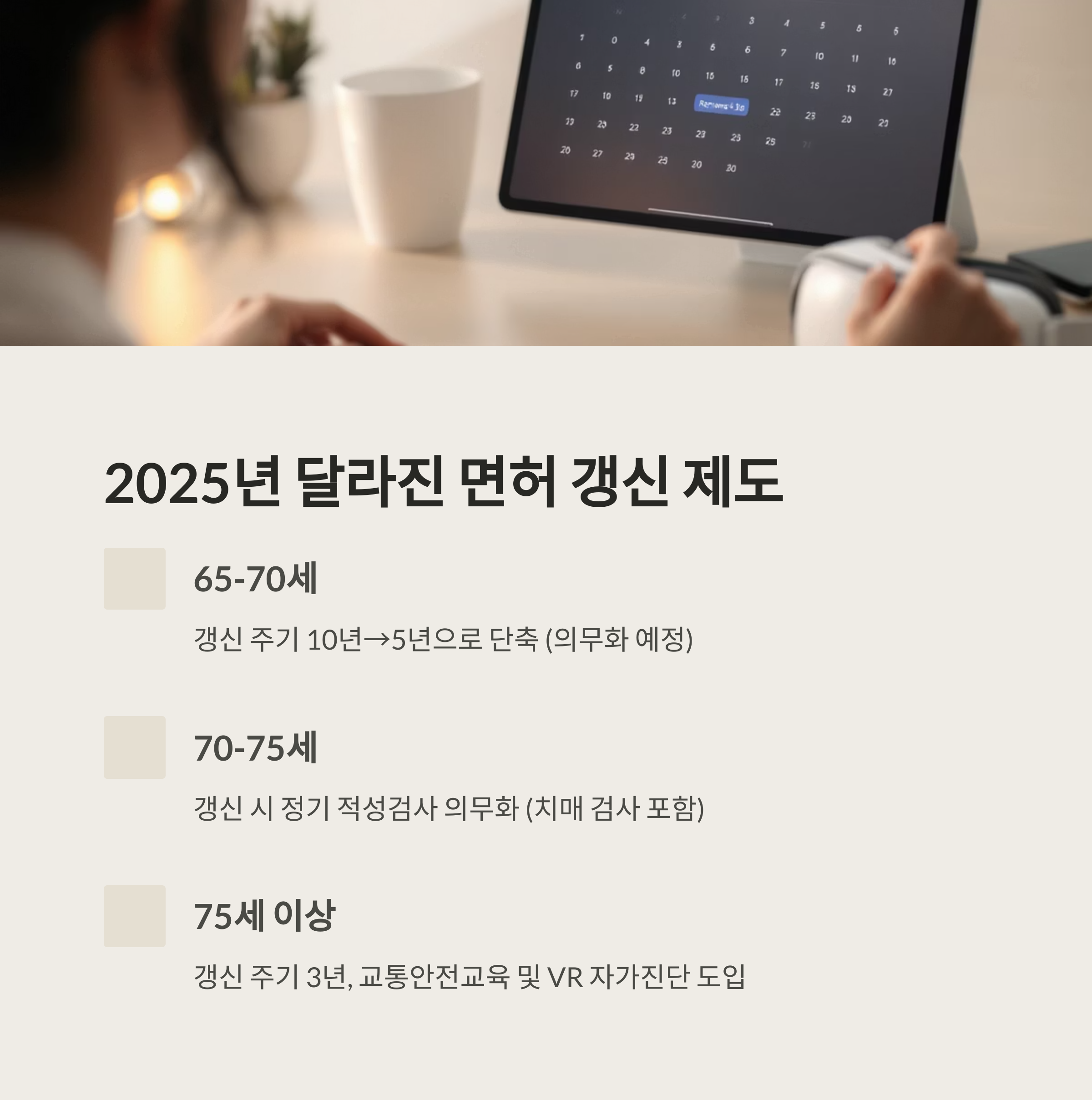 1. 2025년부터 고령 운전자 면허 갱신 주기가 단축되고, 연령별로 차등화된 적성검사 및 교육이 의무화됩니다. (65~70세: 5년, 70~75세: 5년+적성검사, 75세 이상: 3년+교육+VR진단)