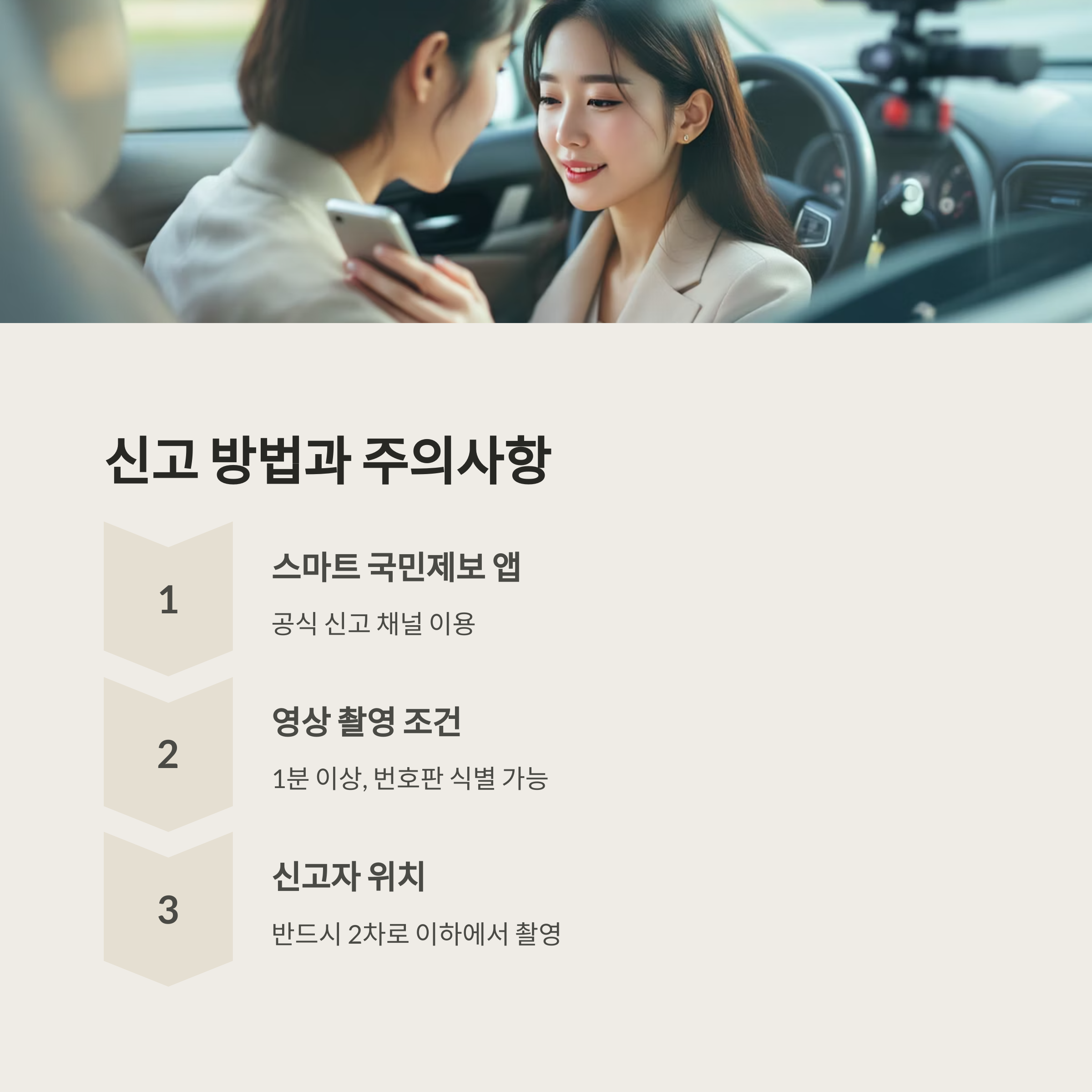 신고 영상에는 날짜, 시간, 위치가 명확히 표시되어야 하며, 블랙박스뿐만 아니라 동승자의 휴대폰으로 촬영한 영상도 신고 자료로 활용할 수 있습니다. 다만 신고자는 반드시 2차로 등 다른 차로에서 촬영해야 하며, 위반 차량의 진입 및 주행 상황이 명확히 드러나야 합니다.