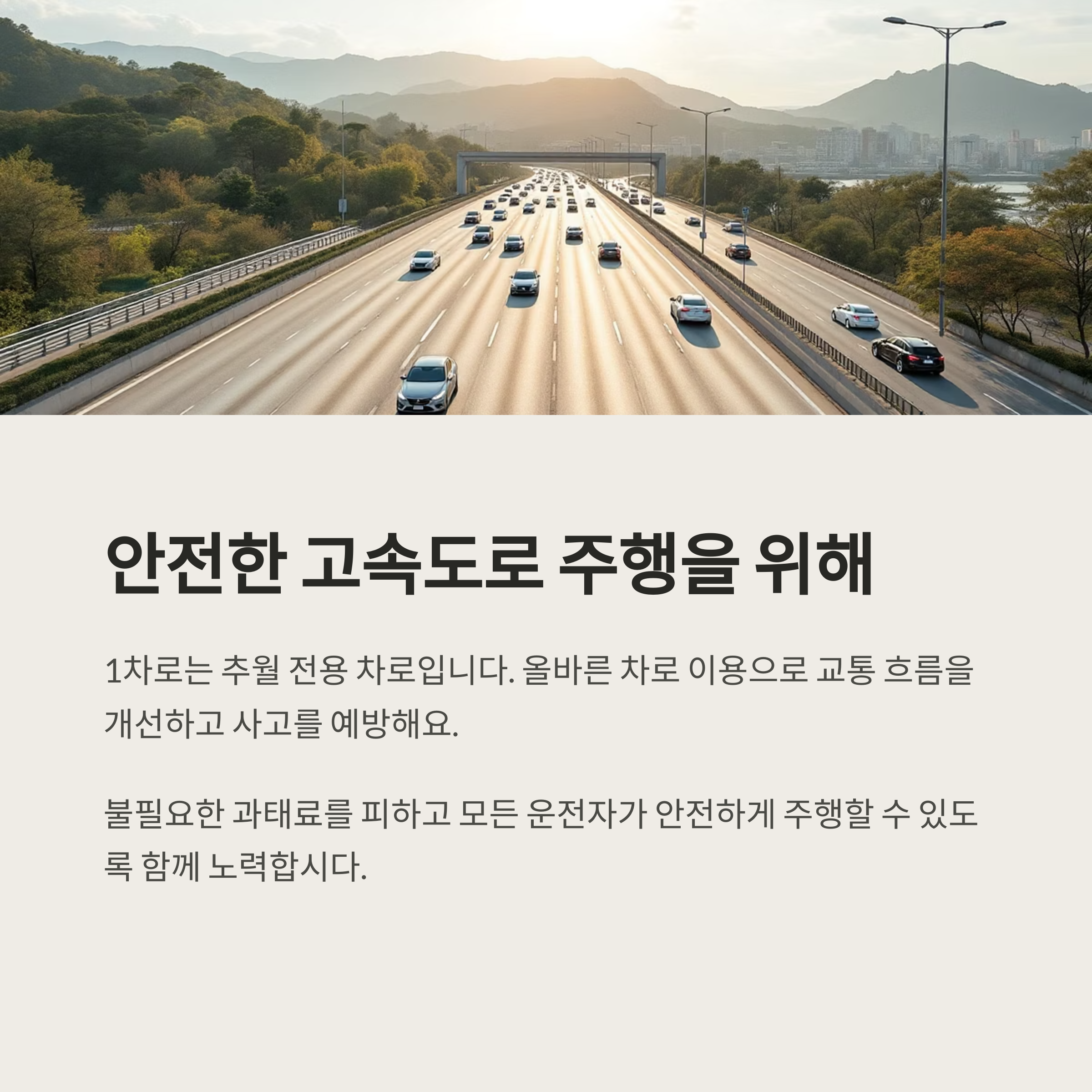 안전한 고속도로 주행을 위해 추월 차로의 올바른 이용법을 숙지하시고, 모든 운전자가 함께 지켜나가는 교통 문화가 정착되기를 바랍니다.