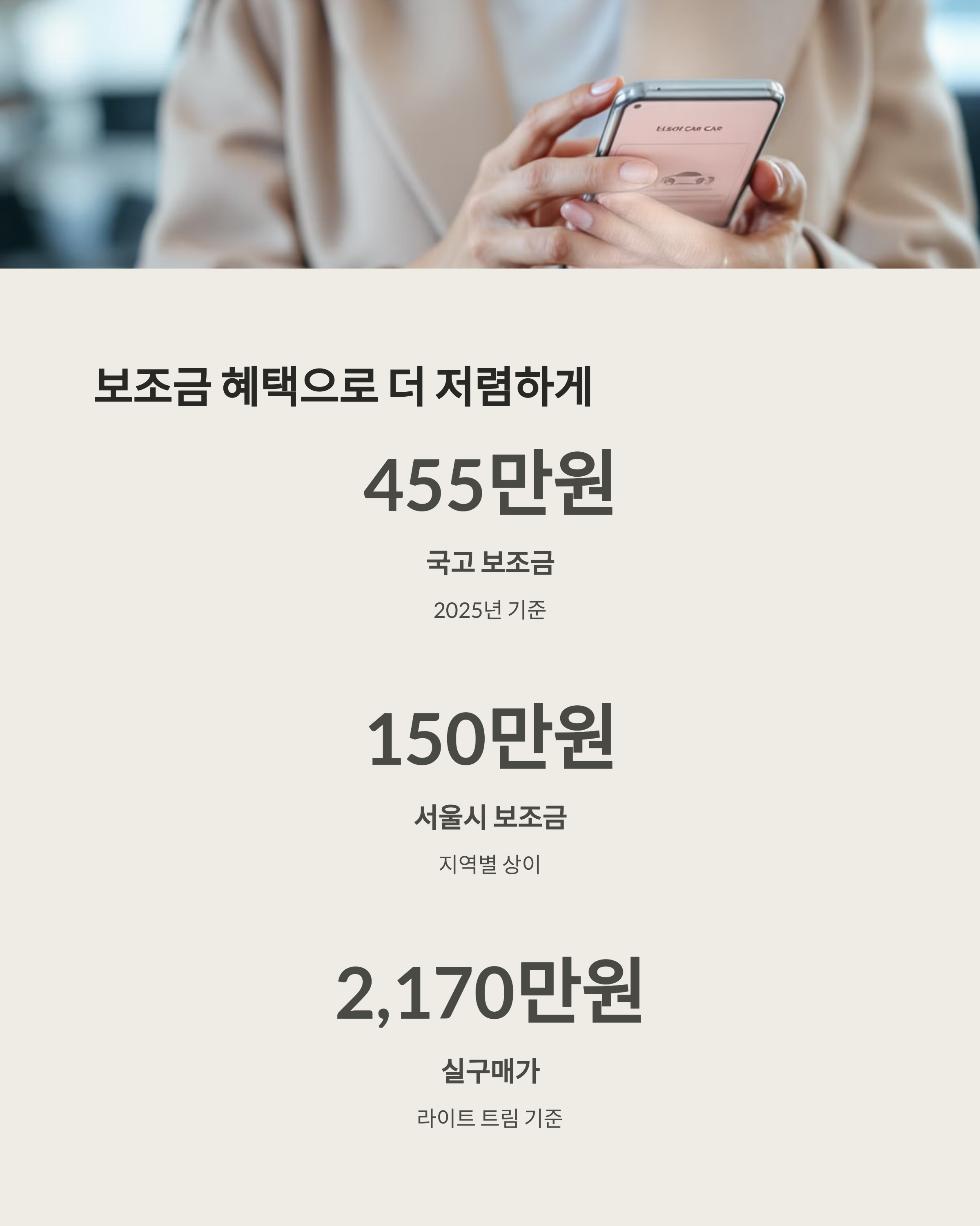 서울 기준으로 예를 들어보면, 라이트 트림의 경우 차량 가격 2,775만원에서 국고 보조금 455만원과 서울시 보조금 150만원을 차감하면 실구매가는 약 2,170만원이 됩니다. 이는 동급 내연기관 경차와 비교해도 경쟁력 있는 수준이라고 할 수 있습니다.