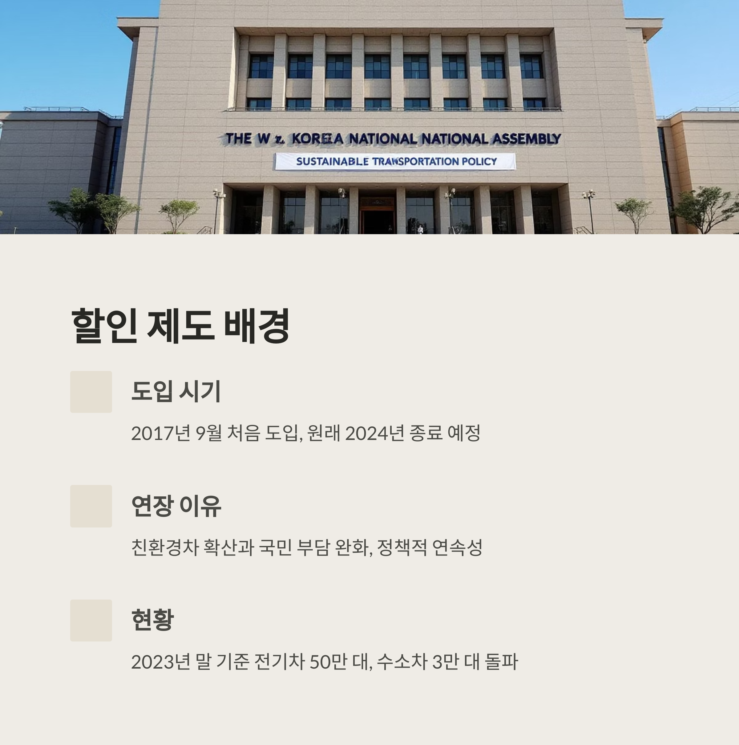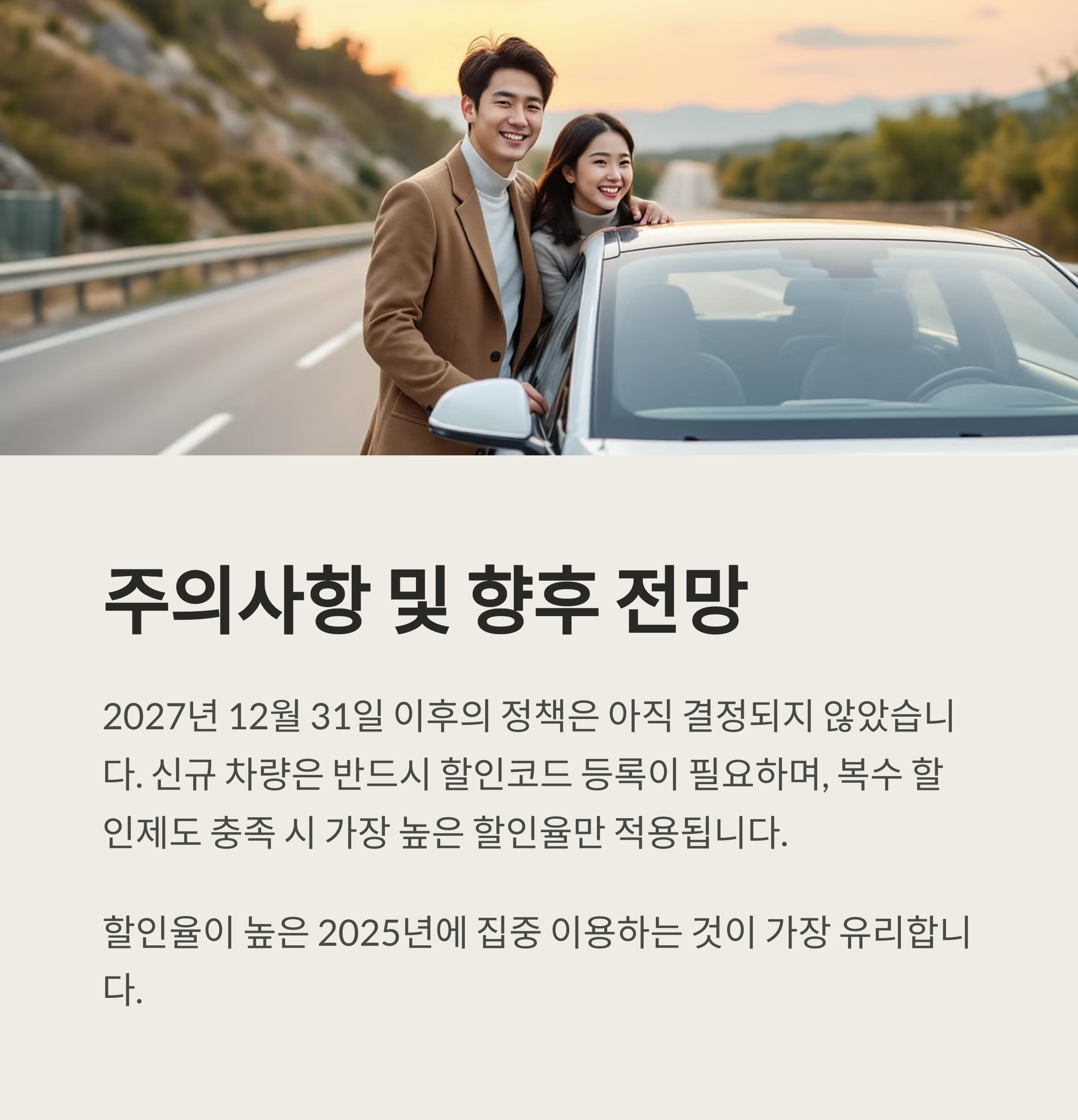 다만, 할인율 축소로 인한 혜택 감소와 2027년 종료 예정에 따라 향후 대체 인센티브 정책 마련이 필요할 것으로 보입니다. 친환경차 보급 확대와 함께 지속 가능한 지원 방안에 대한 논의가 계속될 것입니다.