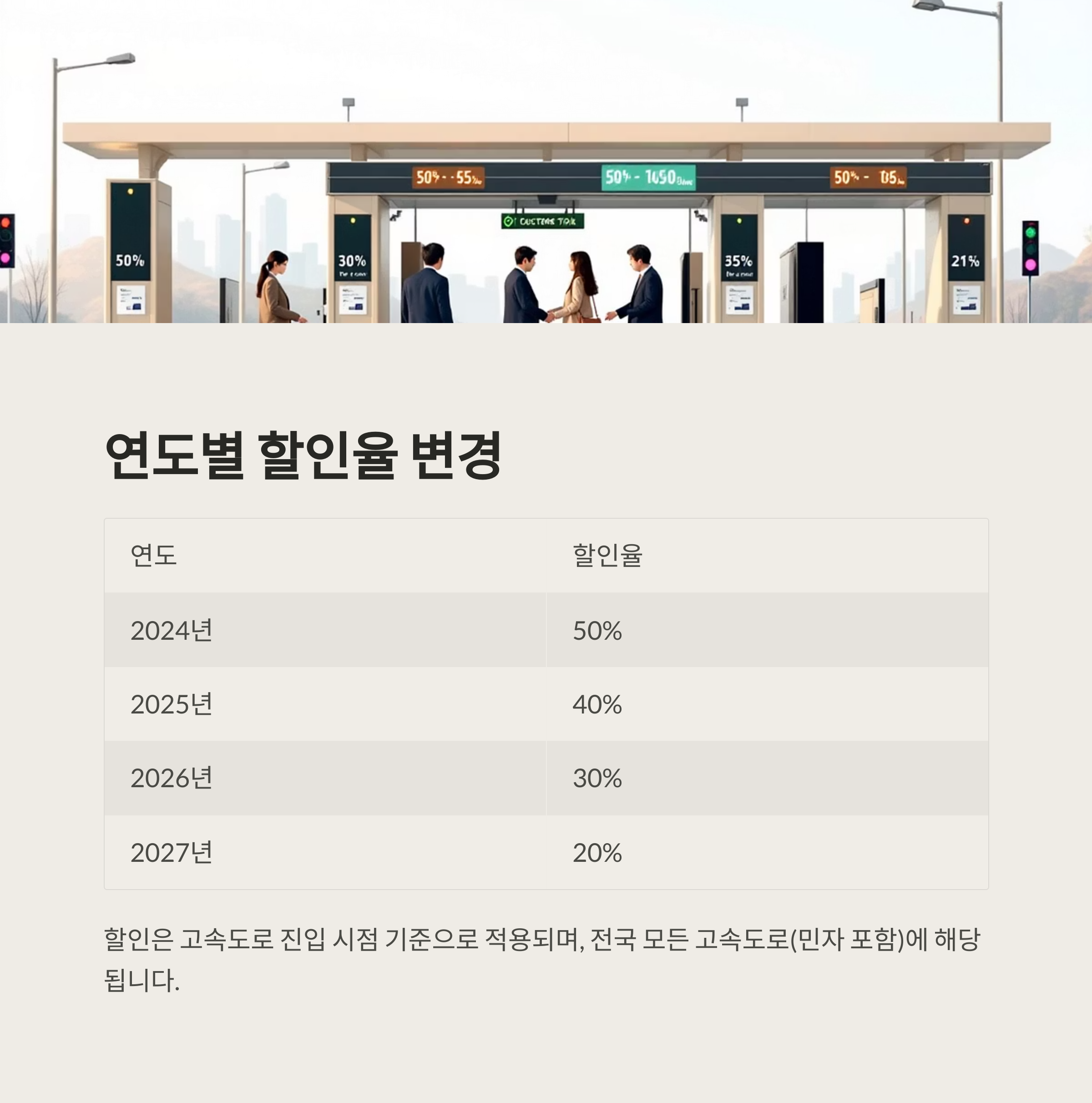 할인율 적용은 고속도로 진입 시점을 기준으로 합니다. 예를 들어, 2024년 12월 31일에 고속도로에 진입하면 50% 할인이 적용되지만, 2025년 1월 1일에 진입하면 40% 할인율이 적용됩니다.
