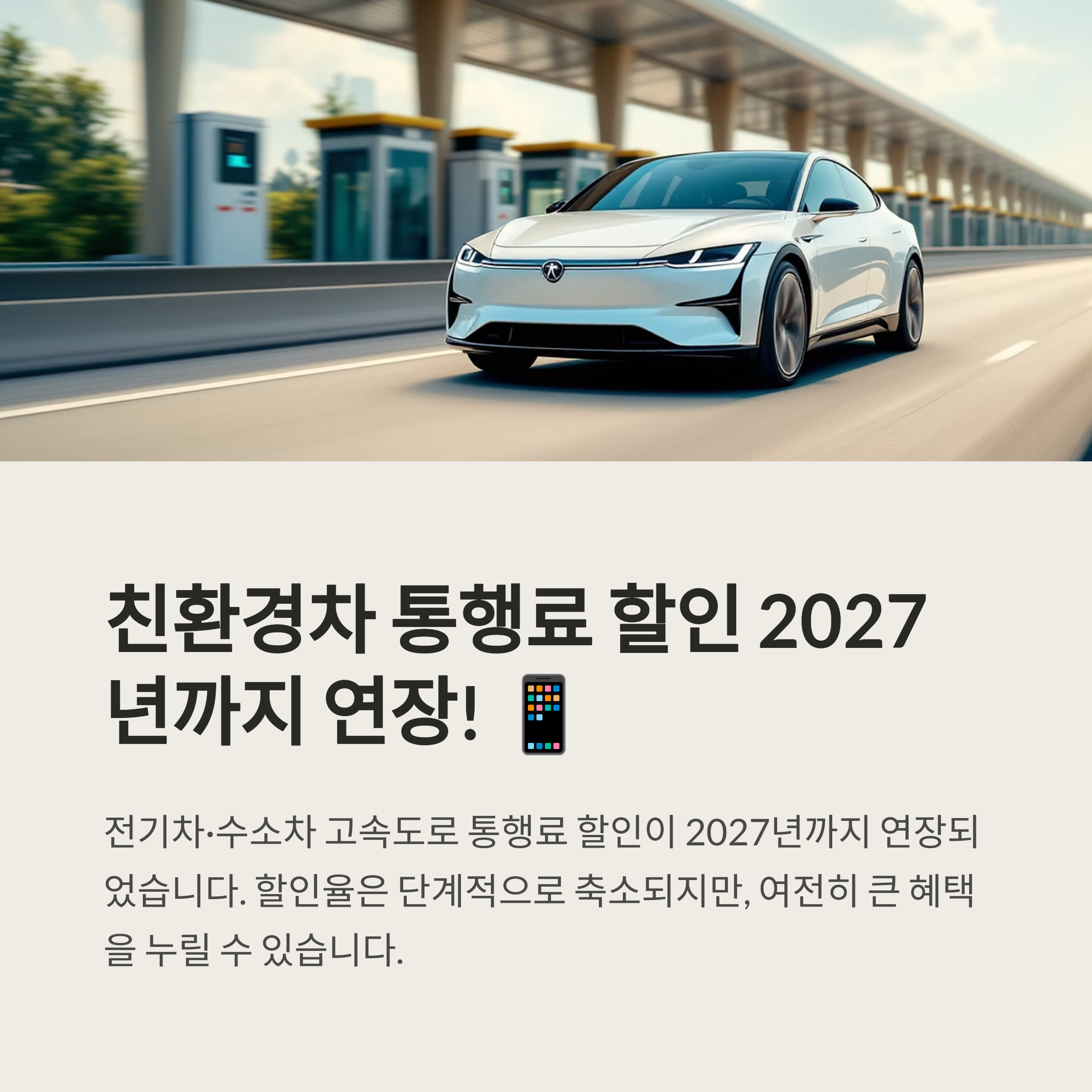 - 전기차·수소차 고속도로 통행료 할인이 2027년까지 연장되며, 할인율은 2025년 40%, 2026년 30%, 2027년 20%로 단계적 축소됩니다.