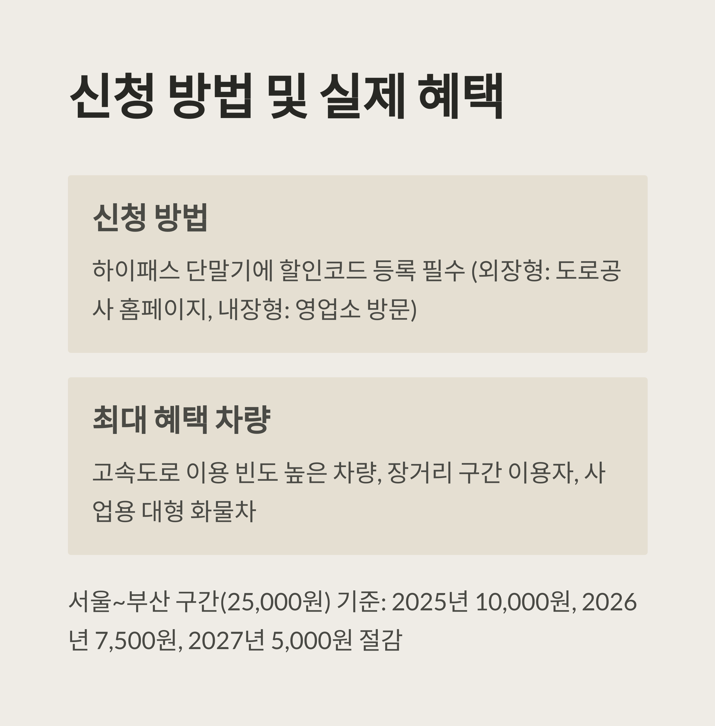 할인율 변경에 따른 실제 절감액을 서울~부산 구간(기준 통행료 25,000원)을 예로 들어 살펴보겠습니다.