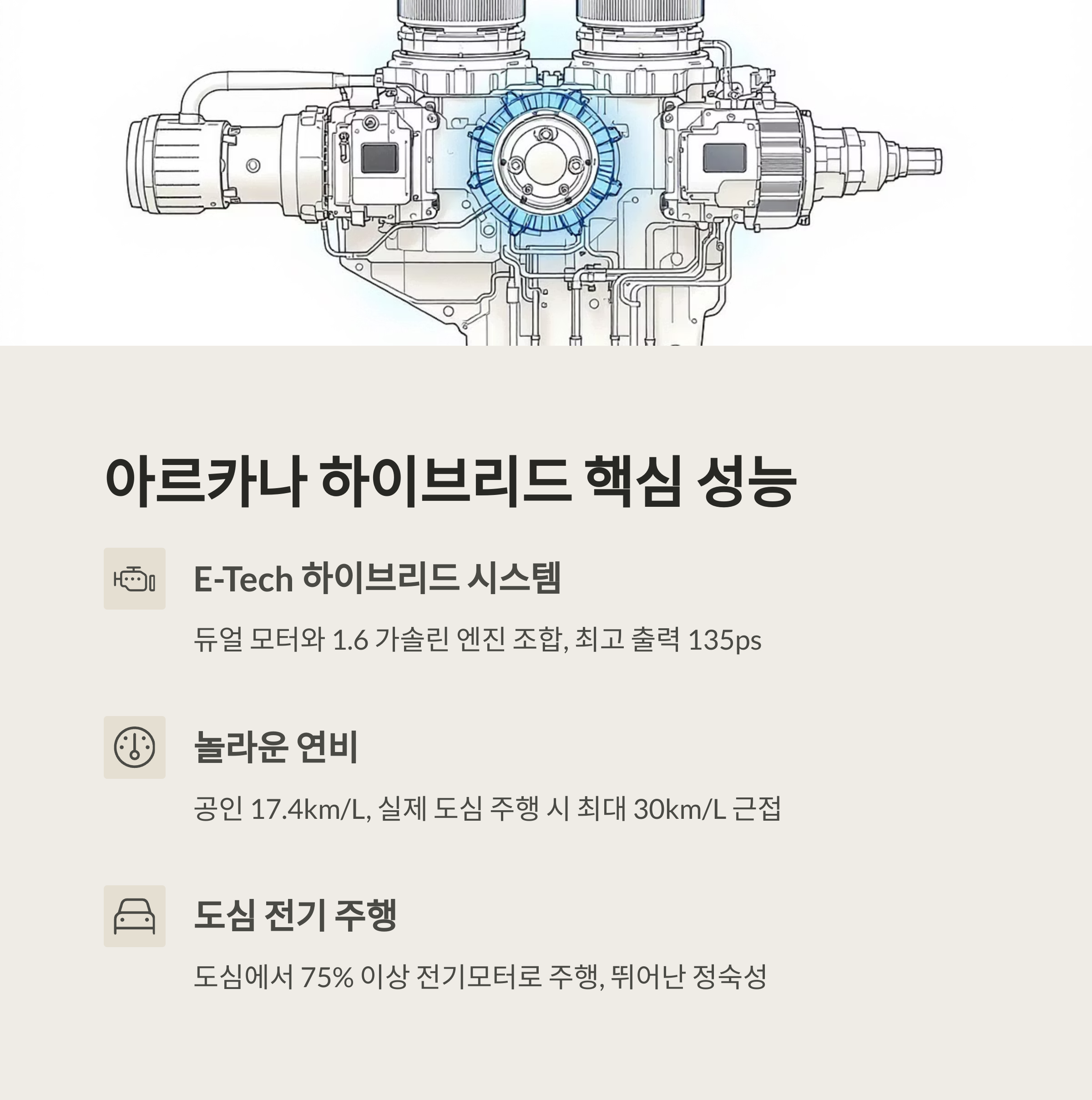 르노 아르카나 하이브리드는 E-Tech 하이브리드 시스템을 탑재한 쿠페형 SUV입니다. 듀얼 모터(발전용, 구동용)와 1.6 가솔린 엔진을 조합한 클러치리스 멀티모드 기어박스를 적용하여, 전기모터 2단과 엔진 변속 4단으로 구성되어 있습니다.