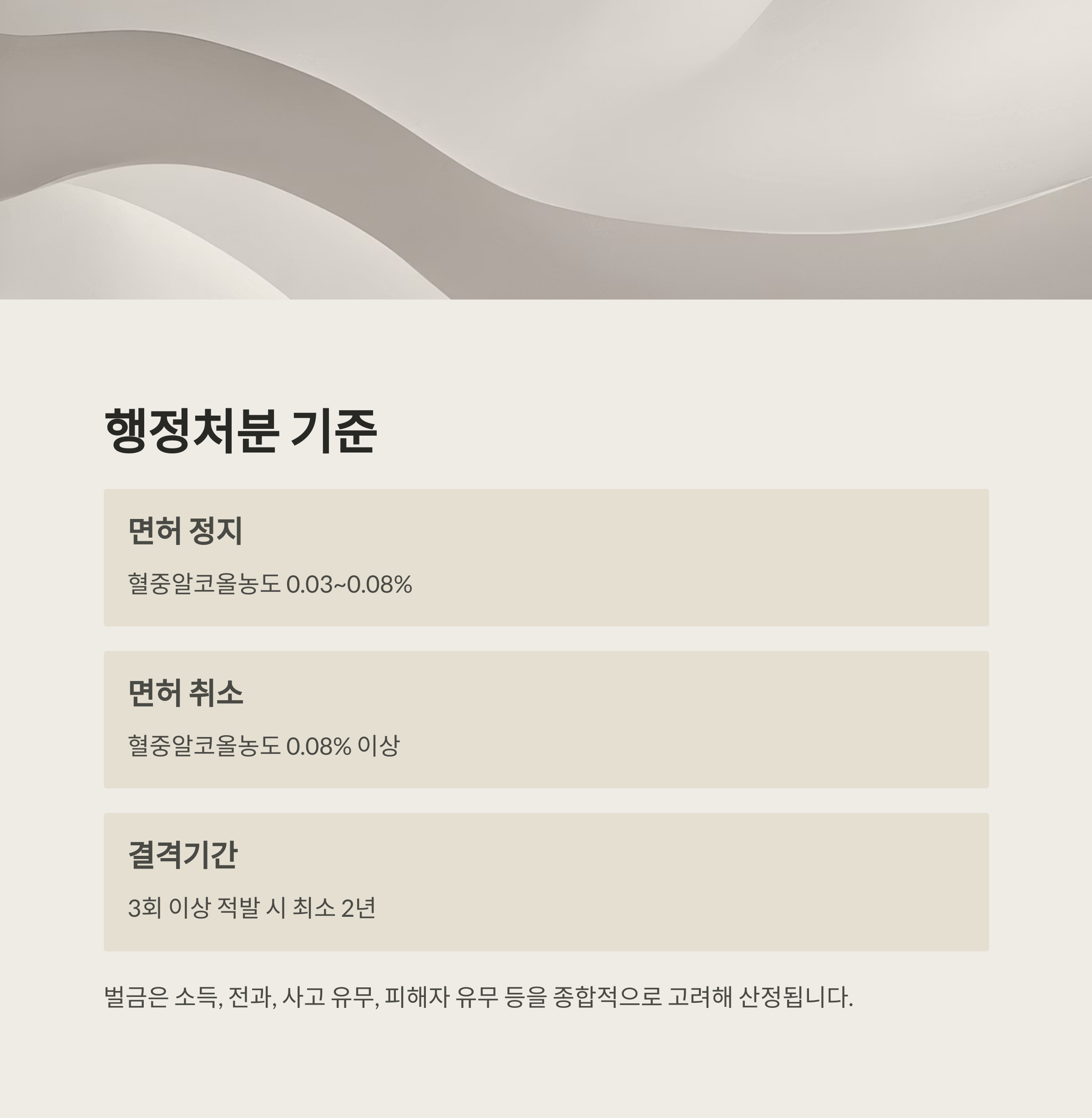 형사처벌과 별개로 진행되는 행정처분은 운전면허에 직접적인 영향을 미칩니다. 기본적인 행정처분 기준은 다음과 같습니다.