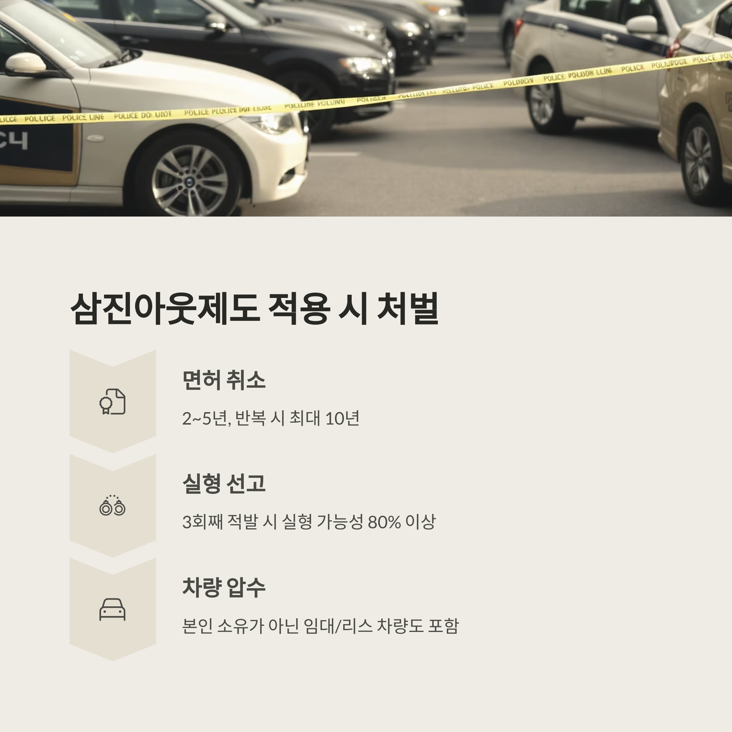 특히 주목할 점은 차량 압수입니다. 삼진아웃 적용 시 적발된 차량이 압수되어 경매나 국가 귀속될 수 있으며, 이는 본인 소유가 아닌 임대나 리스 차량도 포함됩니다.