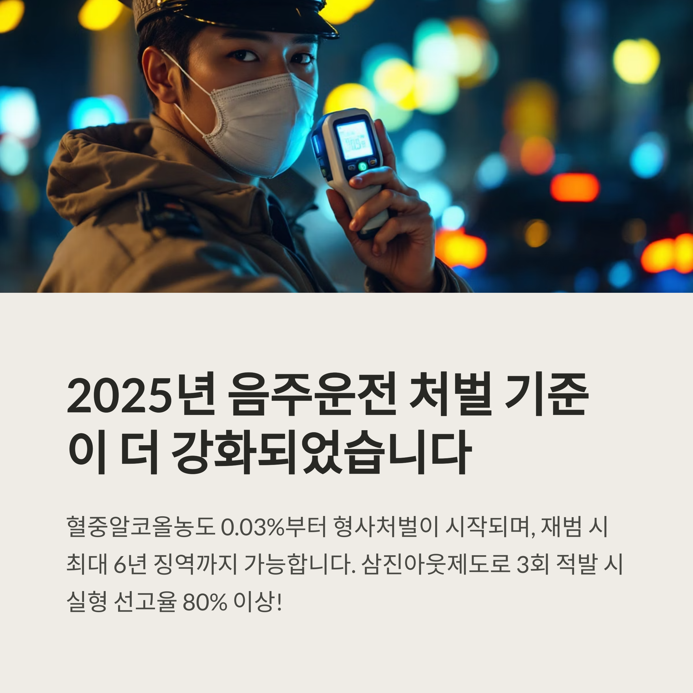 - 2025년 음주운전은 혈중알코올농도 0.03%부터 형사처벌이 시작되며, 재범 시 최대 6년 징역까지 가능합니다.