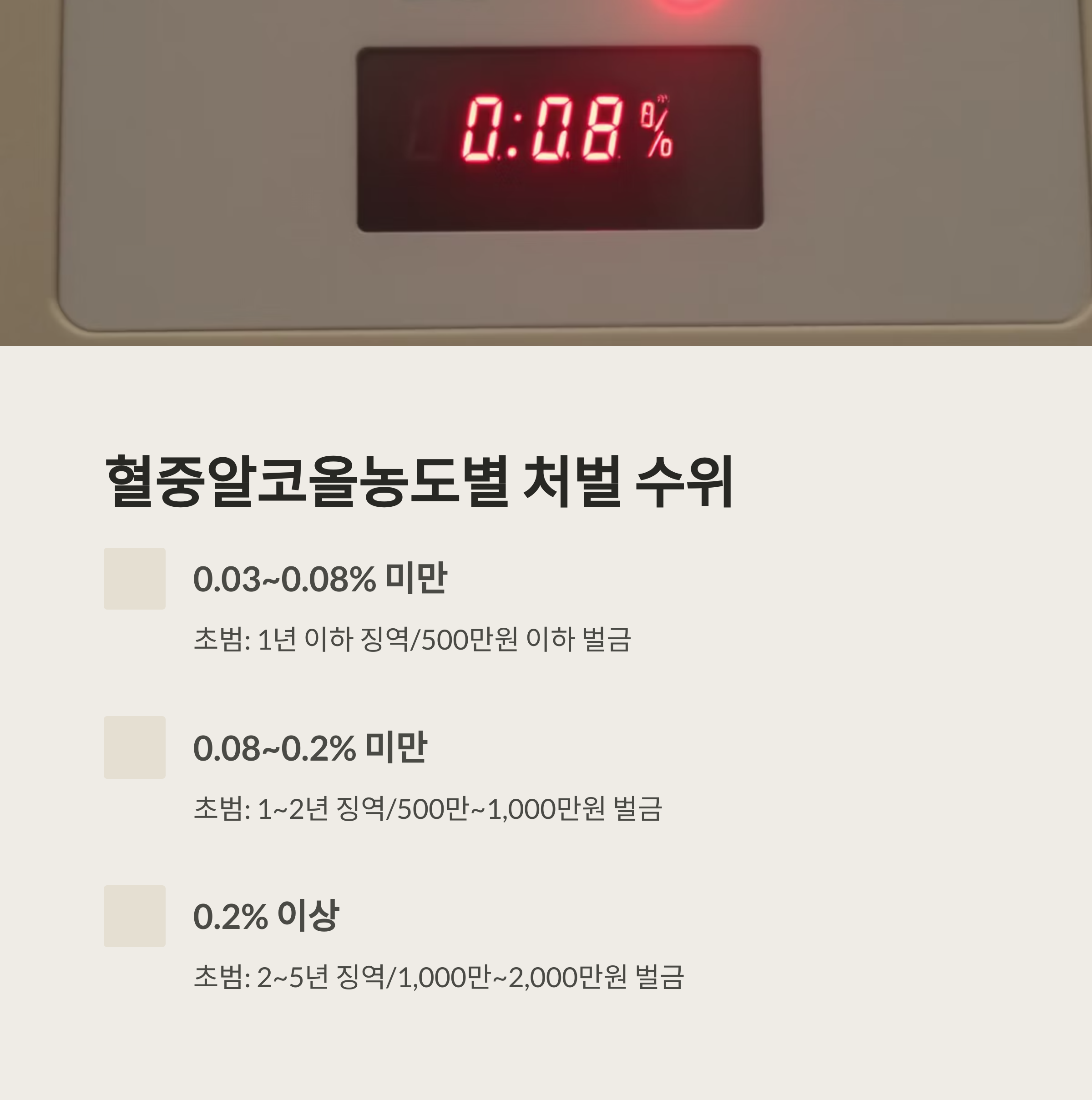| 0.03~0.08% 미만 | 1년 이하 징역 또는 500만원 이하 벌금 |