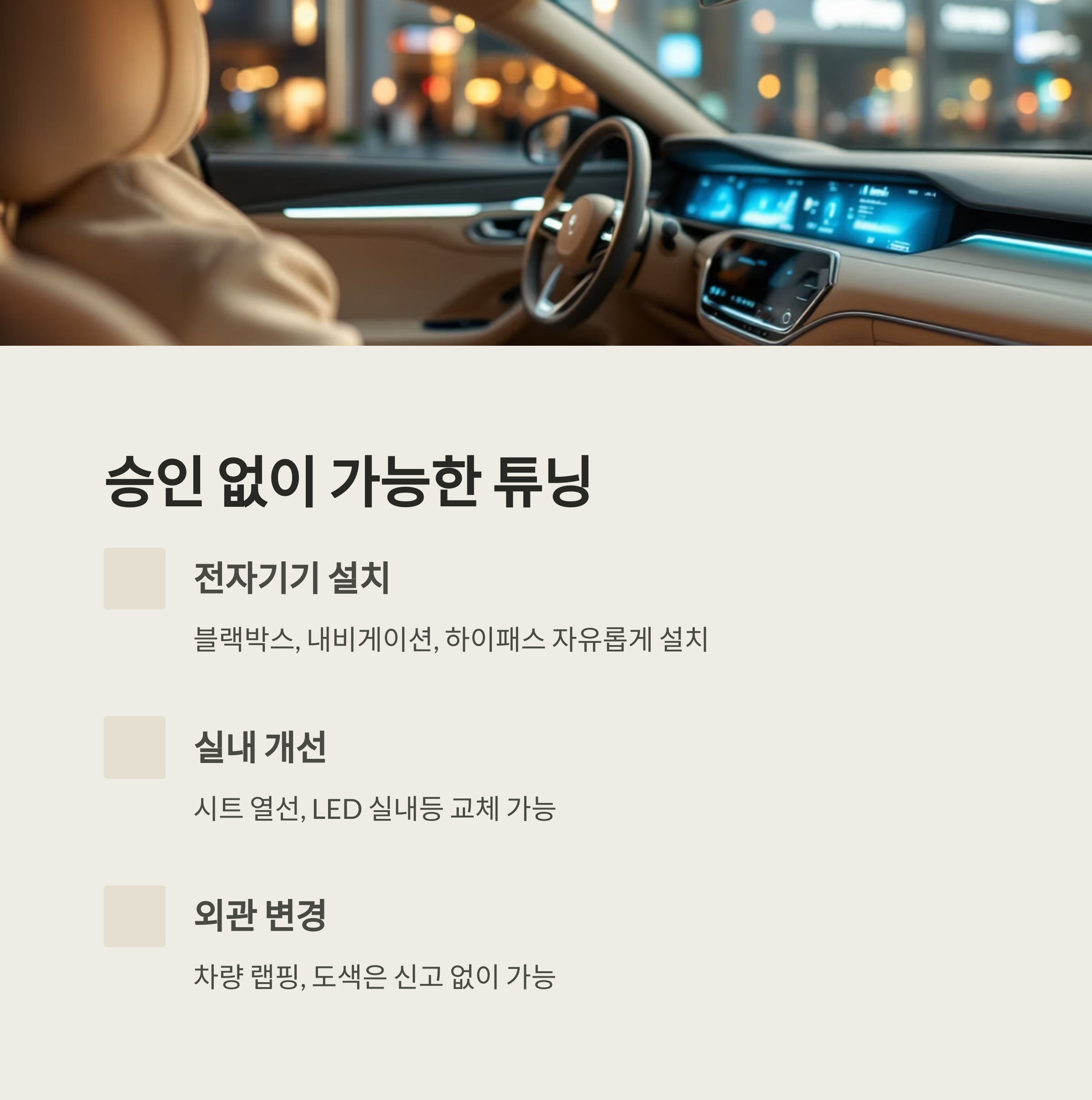 - 2025년 현재 블랙박스, 랩핑, 실내등 교체 등은 승인 없이 가능하며, 엔진·외관 대폭 변경은 승인 필수입니다.