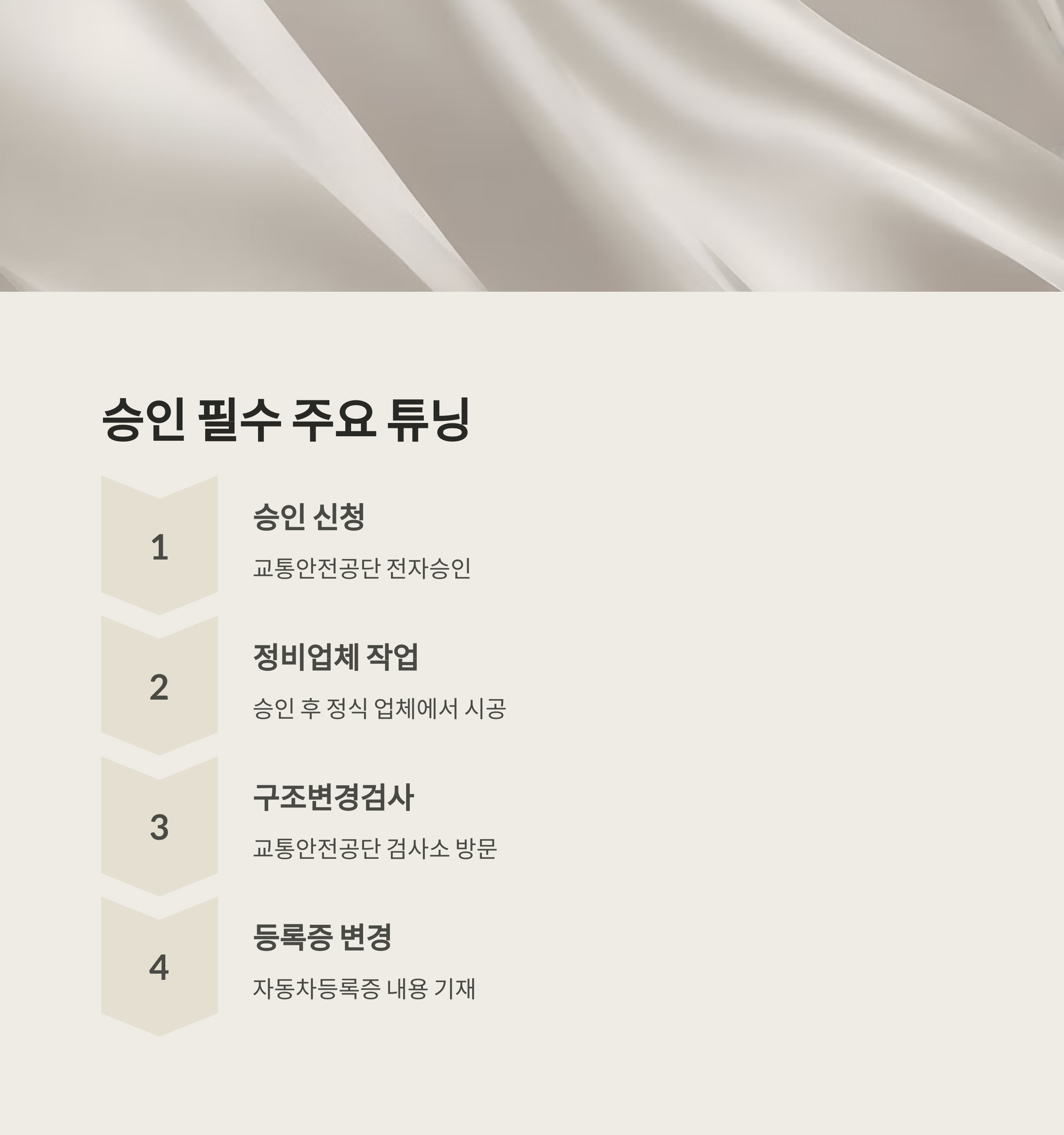 - 합법 튜닝을 위해서는 사전 승인 신청 → 정비업체 작업 → 튜닝검사 → 등록증 변경 순서로 진행해야 합니다.