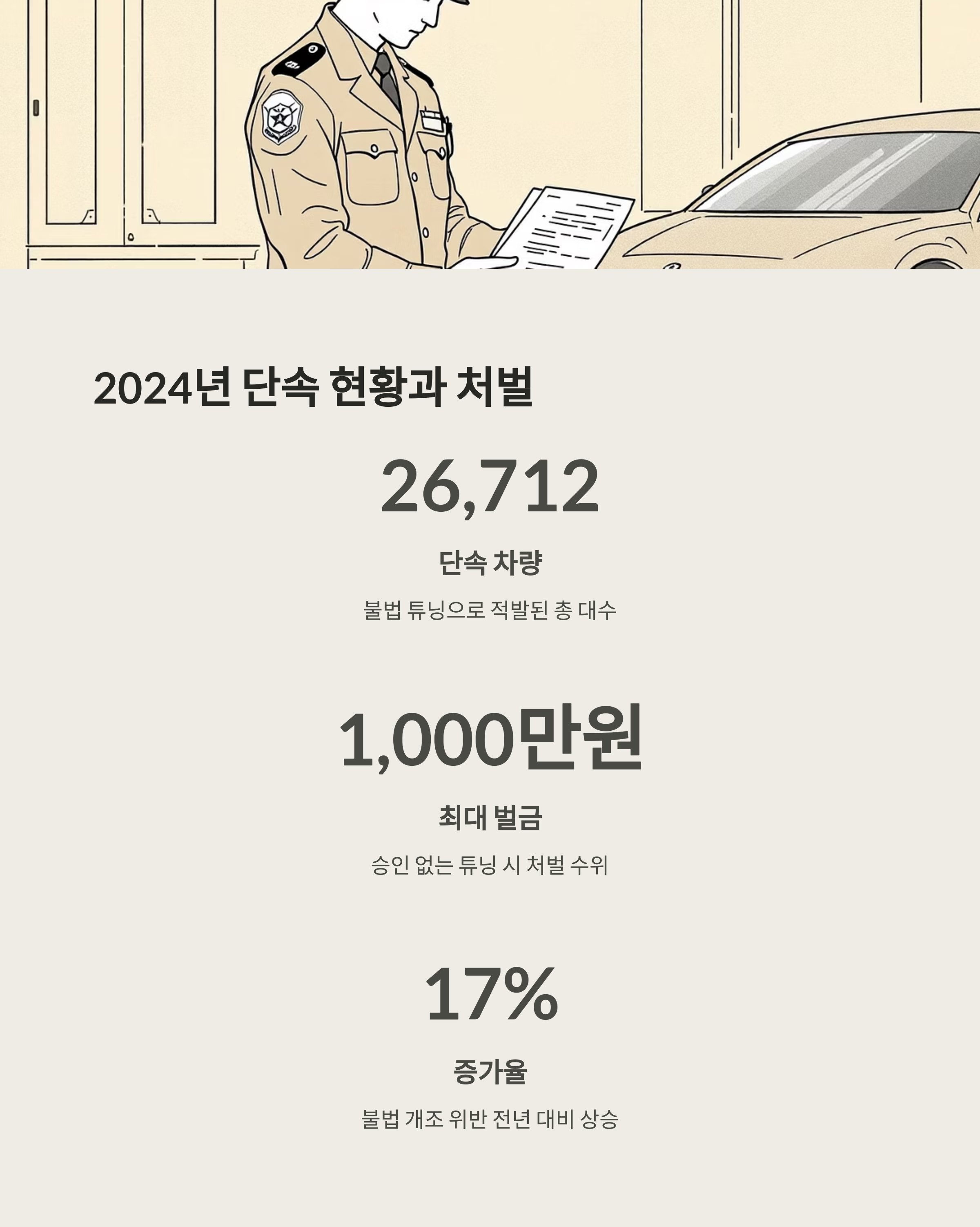 - 2024년 불법 튜닝 단속 26,712대로 여전히 높은 수준이며, 위반 시 최대 1천만 원 벌금이 부과됩니다.