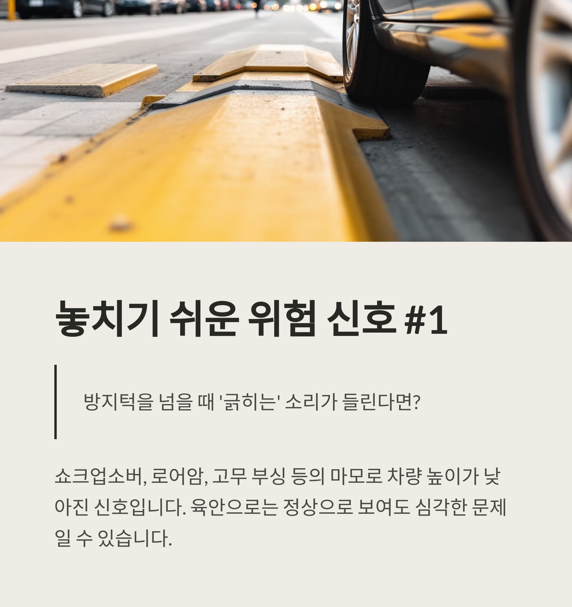 - 방지턱에서 긁히는 소리나 동승자의 멀미 호소는 하체 부품 이상의 명백한 신호입니다.
