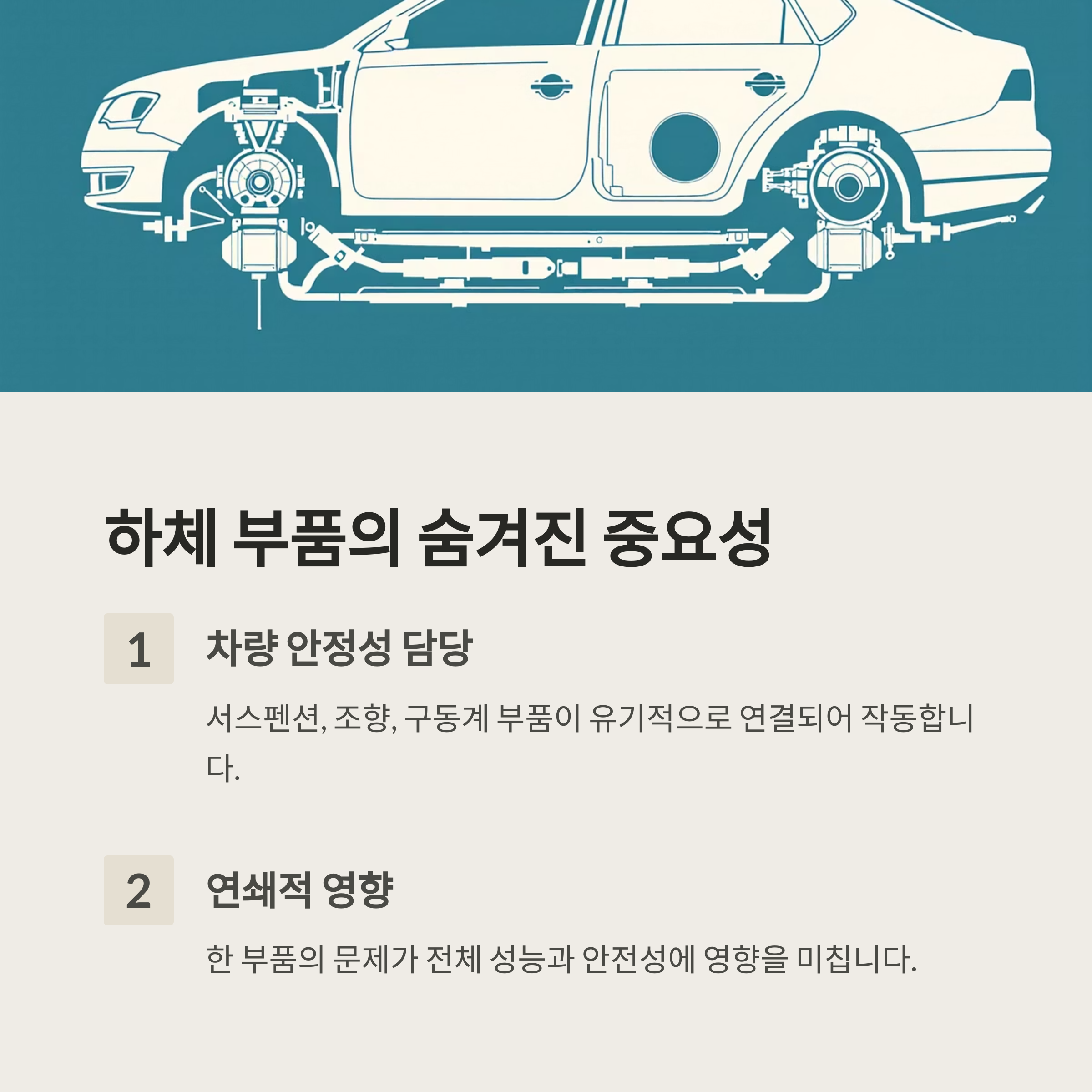 핵심 포인트: 하체 부품들은 독립적으로 작동하는 것이 아니라 서로 연결되어 있어, 한 부품의 문제가 다른 부품에도 연쇄적으로 영향을 미칠 수 있습니다.