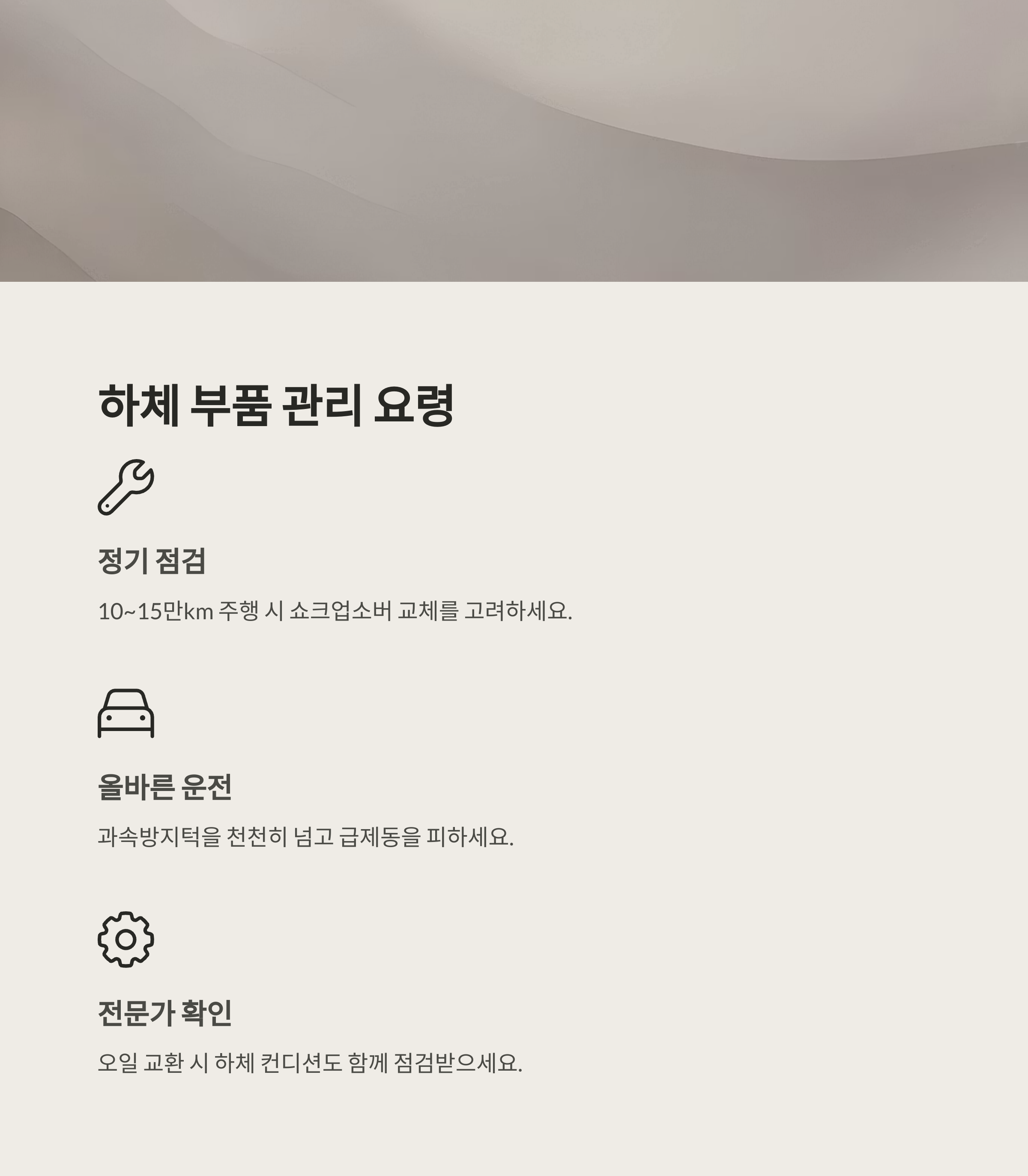 - 10만~15만km 주행 시 쇼크업소버 교체 검토와 정기적인 전문가 점검이 필요합니다.