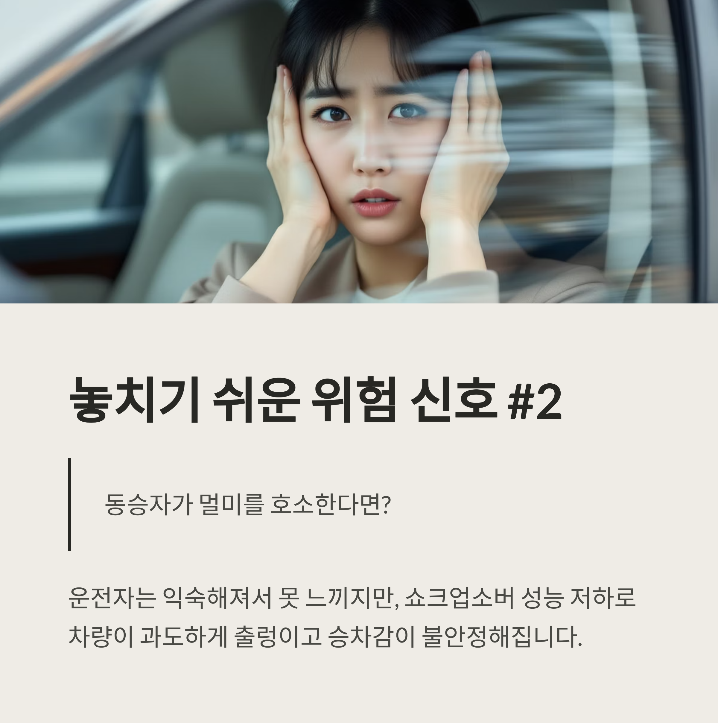 운전자 본인은 익숙해져서 잘 느끼지 못하지만, 동승자가 차량 승차감의 불안정으로 멀미를 호소한다면 서스펜션 불량을 의심해야 합니다.