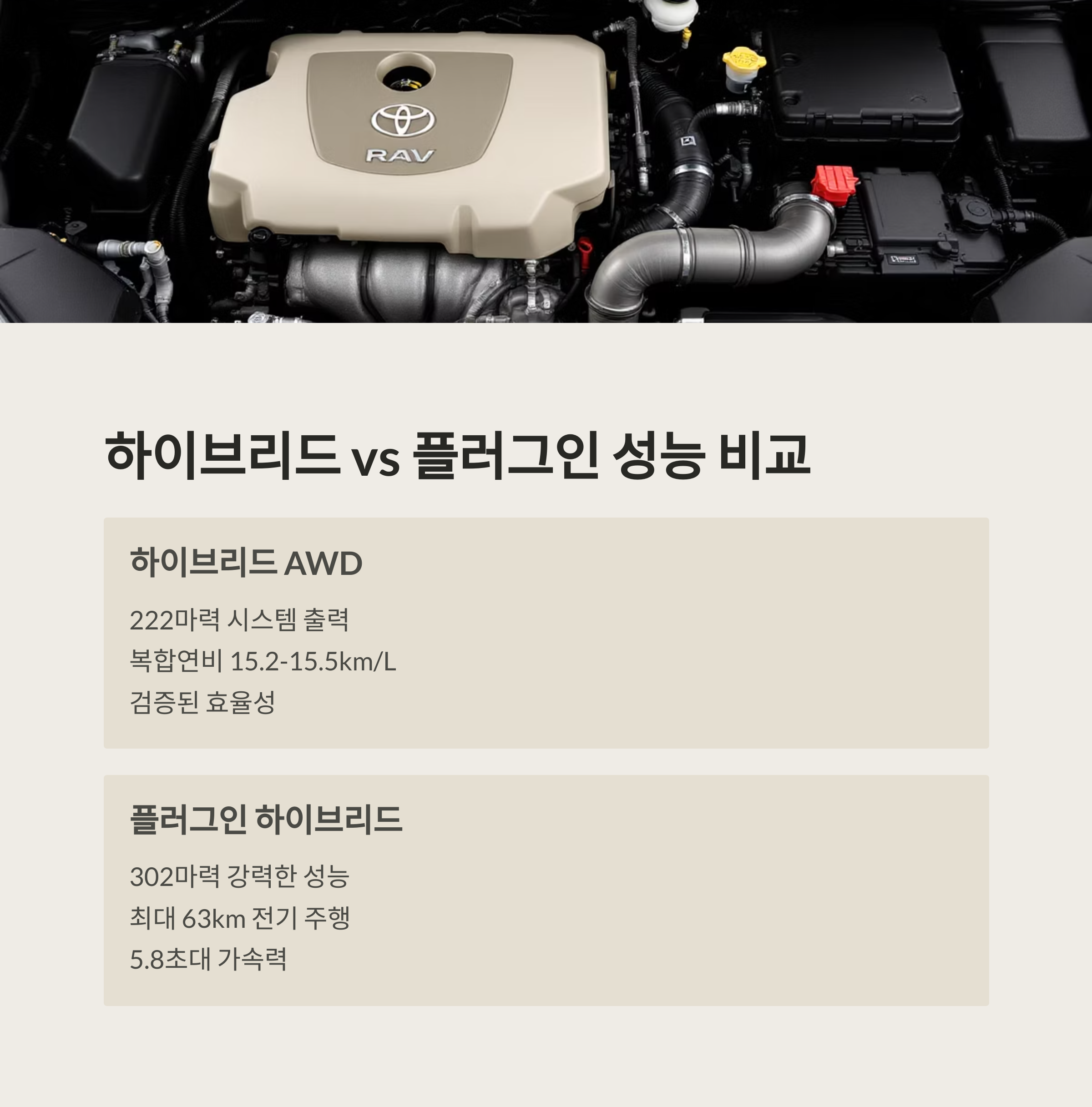 연비 측면에서 RAV4 하이브리드는 복합연비 15.2~15.5km/L를 달성하며, 실주행에서는 16~18km/L까지 가능합니다. 플러그인 하이브리드는 전기모드 주행거리가 최대 63km(공식 기준)이며, 실사용에서는 약 74km 내외의 전기 주행이 가능합니다.