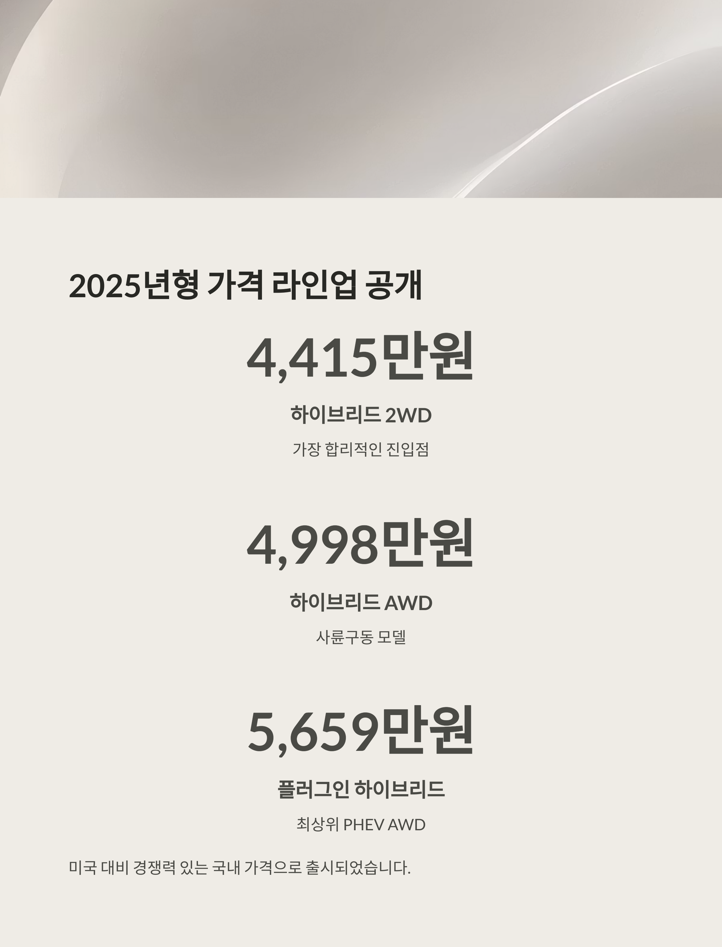 2025년 3월 기준 국내 공식 판매가격을 살펴보면, 하이브리드 2WD 모델이 약 4,415만원으로 가장 합리적인 진입점을 제공합니다. 사륜구동을 원한다면 하이브리드 AWD 모델이 약 4,998만원, 최상위 플러그인 하이브리드(PHEV) AWD 모델은 약 5,659만원에 판매되고 있습니다.