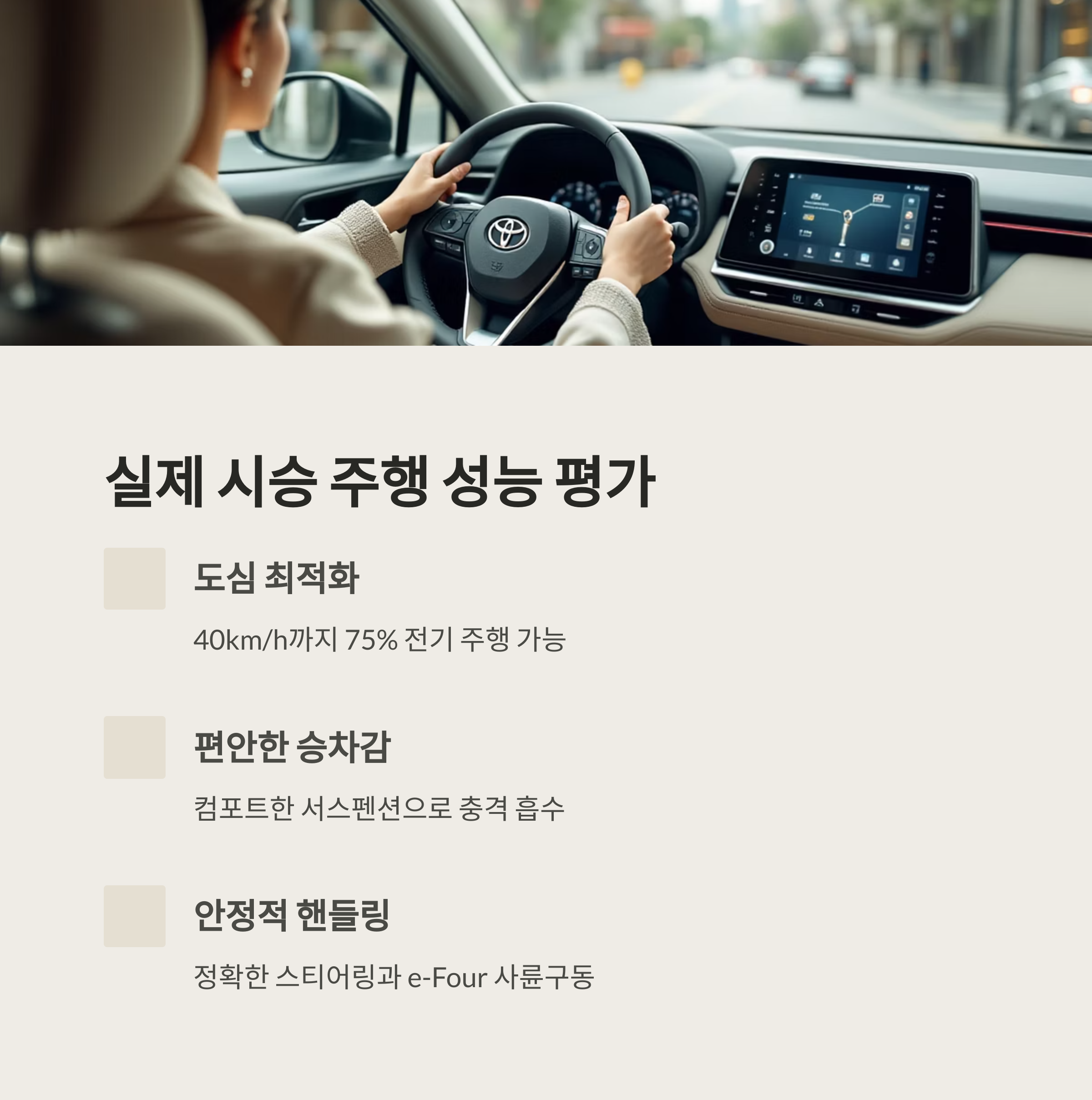 실제 시승 결과 RAV4 하이브리드는 도심 주행에 최적화된 특성을 보여줍니다. 40km/h까지 약 75%의 주행을 전기로만 할 수 있어 시내 주행에서 극강의 효율을 추구합니다.