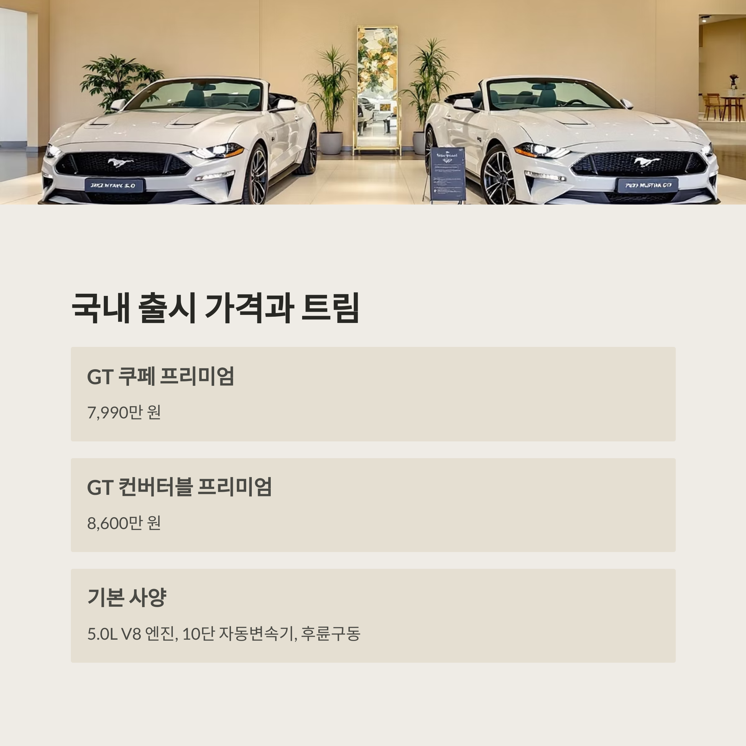 - 2025 포드 머스탱 GT 5.0은 쿠페 7,990만 원, 컨버터블 8,600만 원으로 5.0리터 V8 자연흡기 엔진의 감성을 경험할 수 있습니다.