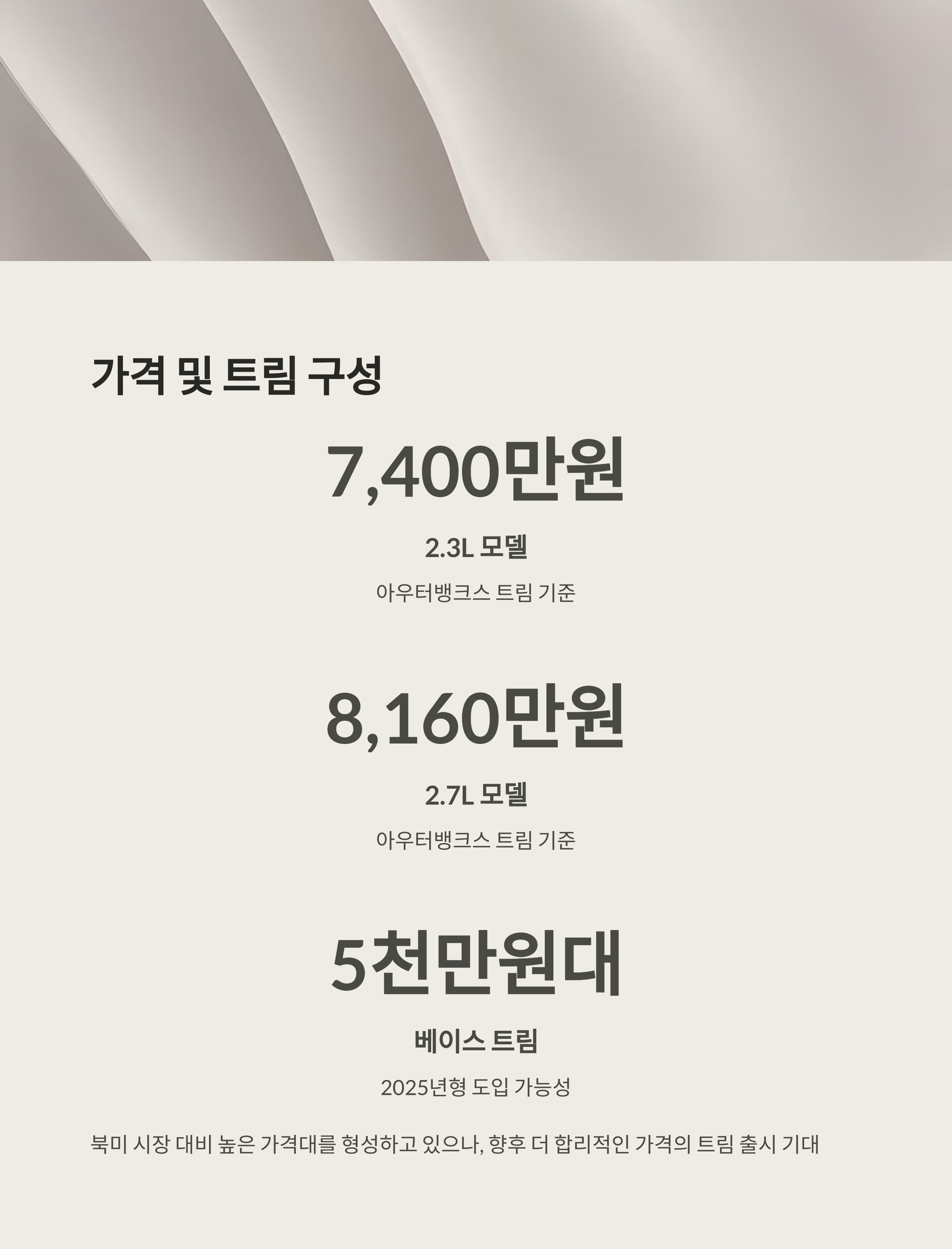 현재 국내 출시 가격은 2.3L 모델 7,400만 원, 2.7L 모델 8,160만 원으로 책정되어 있습니다. 이는 아우터뱅크스 트림 기준으로, 북미 시장 대비 높은 가격대를 형성하고 있는 상황입니다.