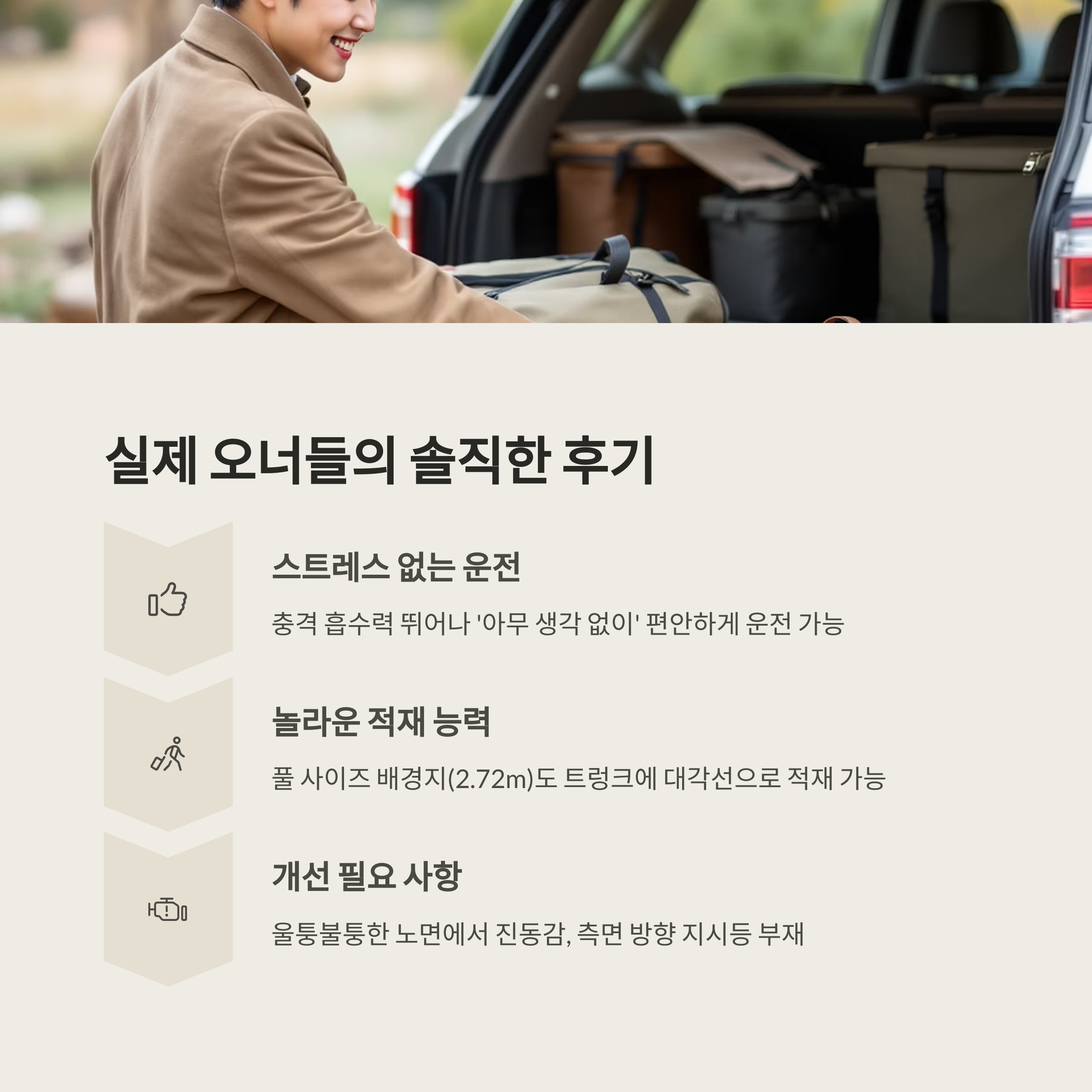 실제 오너들이 공통적으로 언급하는 가장 큰 장점은 '아무 생각 없이' 편안하게 운전할 수 있다는 점입니다. 포장 상태가 좋지 않은 도로나 과속 방지턱을 만나도 차량이 알아서 충격을 흡수하고 안정성을 유지해줍니다. 이는 오프로드 특화 서스펜션의 장점이 일상 주행에서도 그대로 발휘되는 결과입니다.