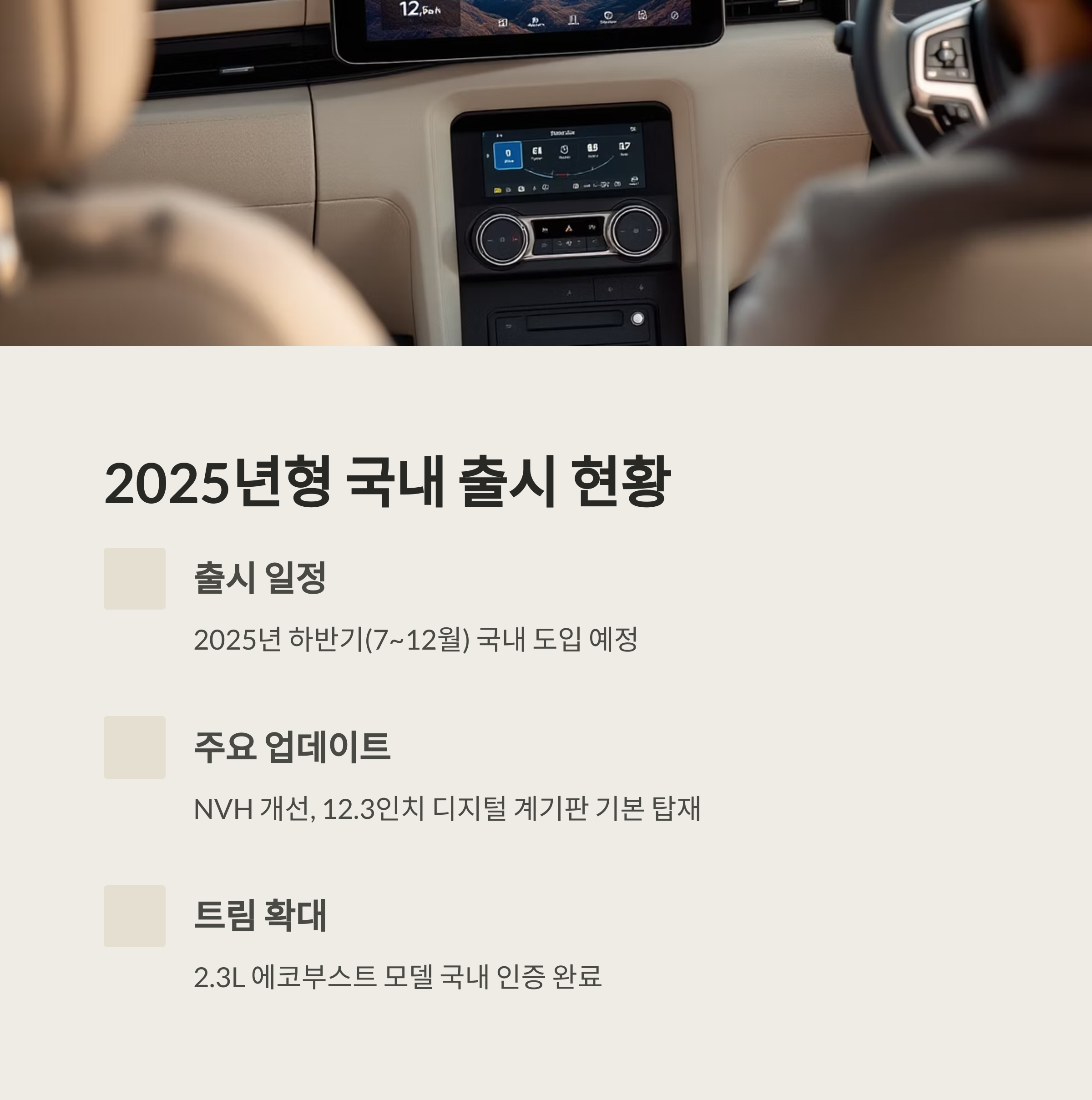 - 2025년형 포드 브롱코는 하반기 국내 출시 예정으로, 개선된 NVH 성능과 첨단 편의사양을 갖춘 완성도 높은 모델입니다.