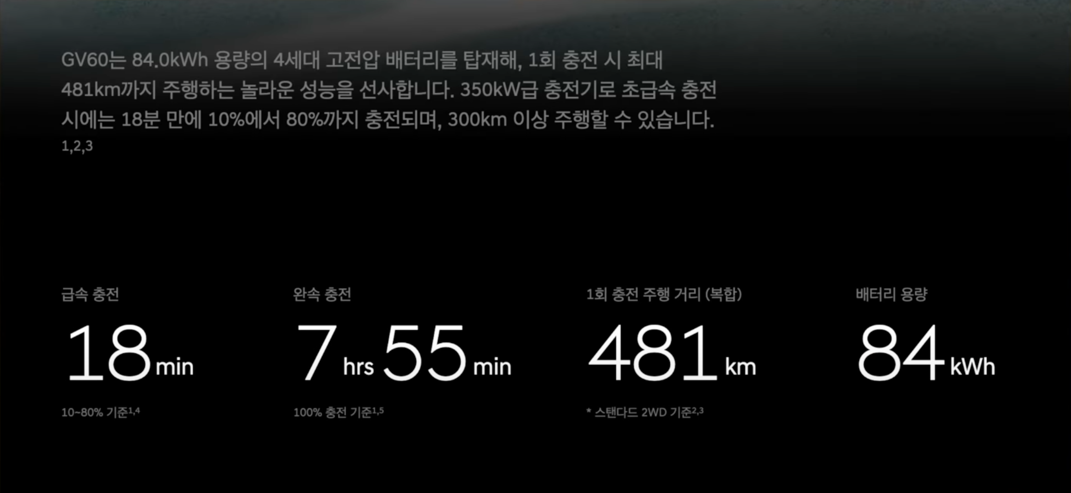 GV60 페이스리프트 모델의 가장 주목할 만한 변화 중 하나는 성능과 주행 거리의 개선입니다. 이 모델은 84.0kWh 용량의 4세대 고전압 배터리를 탑재하여 1회 충전 시 최대 481km까지 주행이 가능해졌습니다. 이는 기존 모델 대비 상당한 주행 거리 향상으로, 전기차의 주요 단점 중 하나인 주행 불안을 크게 해소했습니다.