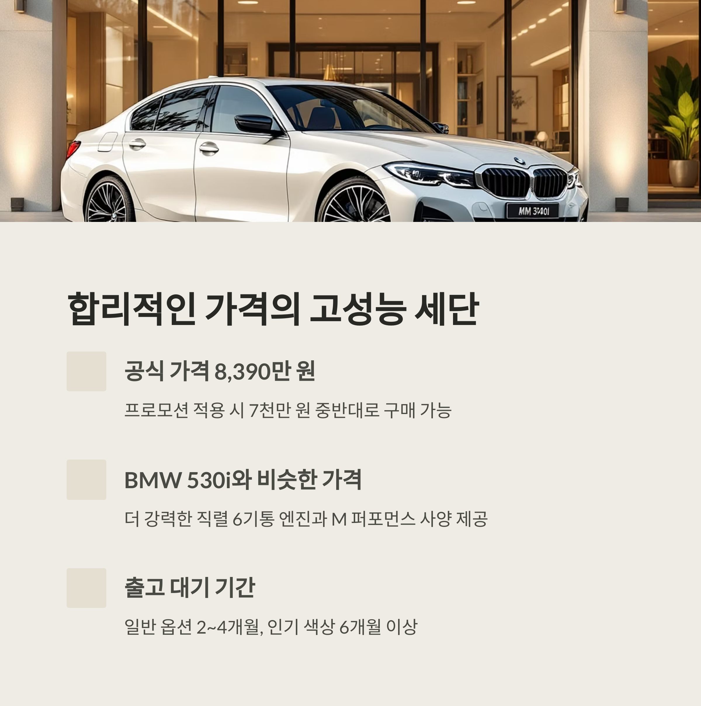결론적으로 BMW M340i 세단 LCI2는 강력한 성능과 일상적 쾌적함, 첨단 사양을 모두 원하는 운전자들에게 최적의 선택지라고 말씀드릴 수 있습니다. 특히 BMW 특유의 핸들링과 직렬 6기통 엔진의 매력을 경험하고 싶으시다면, 이보다 더 좋은 기회는 찾기 어려울 것입니다.
